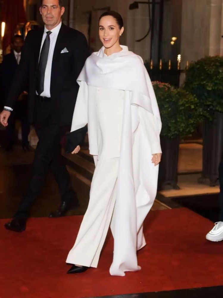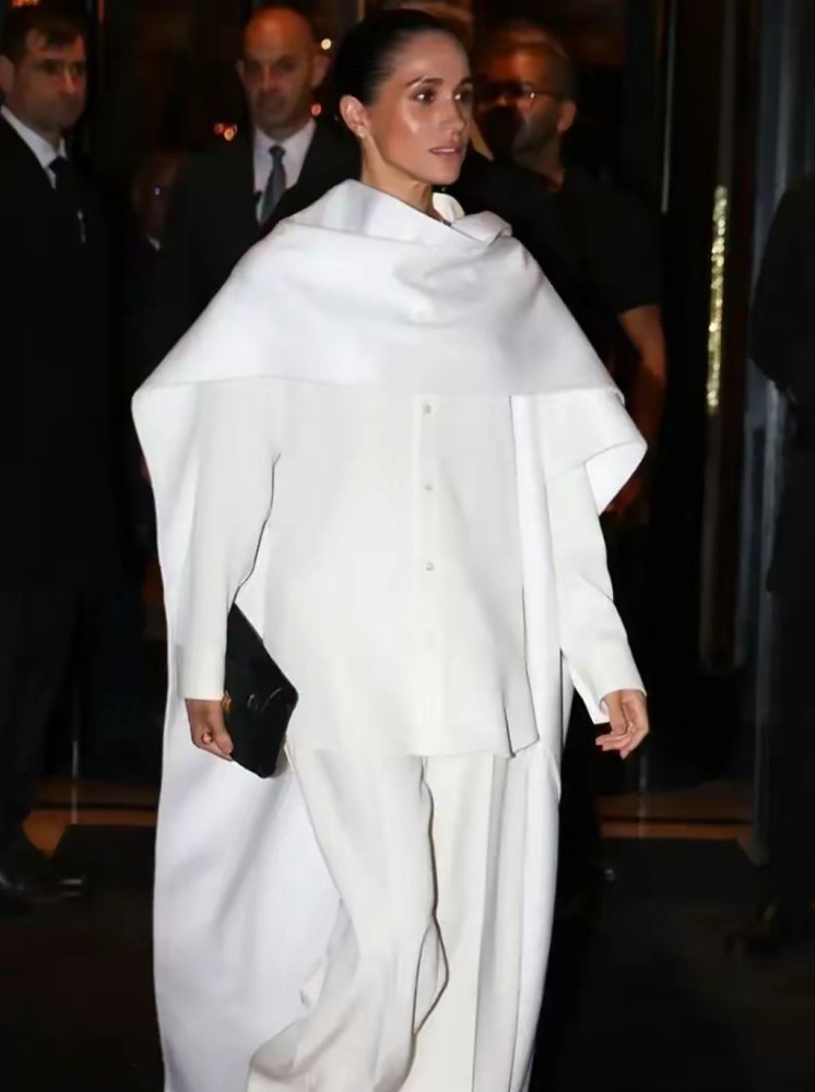 Meghan Markle tampil memukau saat debutnya untuk Balenciaga di Paris Fashion Week. Ia hadir di show Balenciaga Spring/Summer 2026 dengan gaya serba putih yang simpel. Meghan mengenakan kemeja putih, wide leg trousers berpotongan clean, dan cape berpotongan dramatis yang membuat penampilannya terlihat elegan.