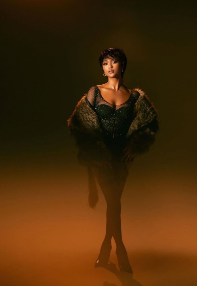 Penampilannya semakin menarik dengan riasan bernuansa hangat, dipadukan dengan lipstik coklat dan eyeshadow lembut yang menonjolkan keanggunannya secara natural. Marion mengenakan jumpsuit hitam berhias beads rancangan Joerdana, lengkap dengan syal berbulu dan anting silver yang memberikan sentuhan glamor yang seimbang.