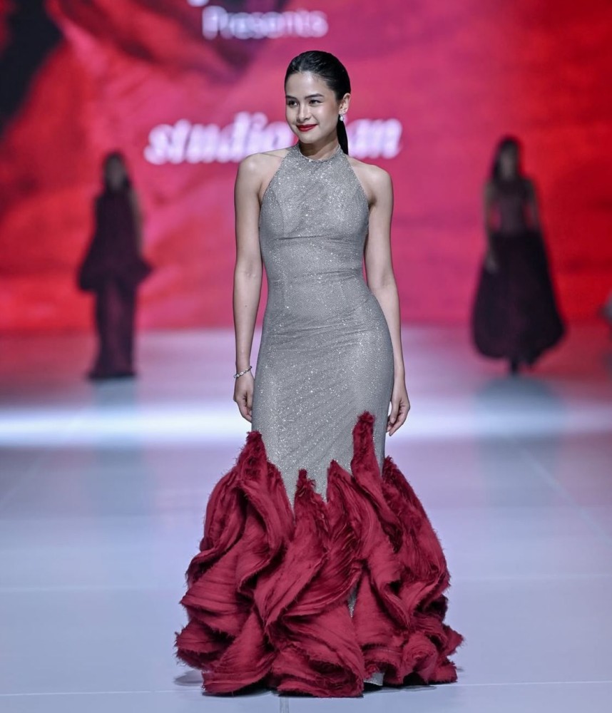 Riasan wajah Maudy dibuat bold namun tetap natural, dengan lipstik merah gelap sebagai fokus utama. Rambut mediumnya ditata sleek braided ponytail, memberikan kesan rapi dan modern yang melengkapi keseluruhan tampilannya di panggung mode tersebut.