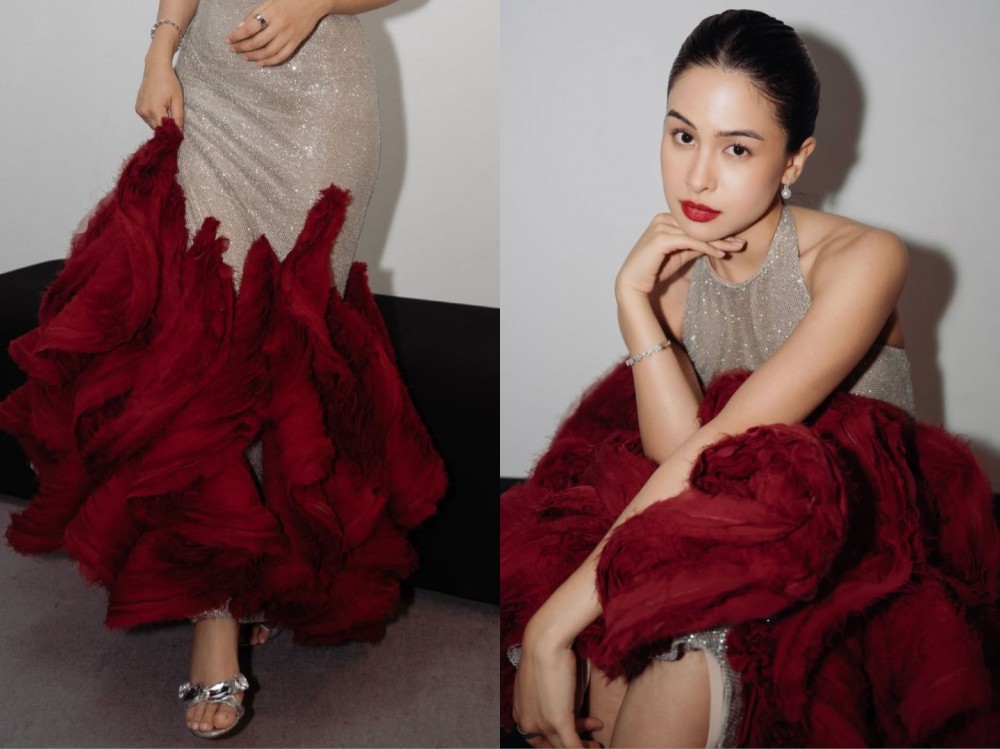 Gaun tersebut dihiasi aksen ruffle bulu berwarna merah di bagian bawah, menambahkan tekstur lembut yang kontras dengan kilau sequin. Potongan halterneck membuat tampilan Maudy tetap seimbang antara glamor dan minimalis.