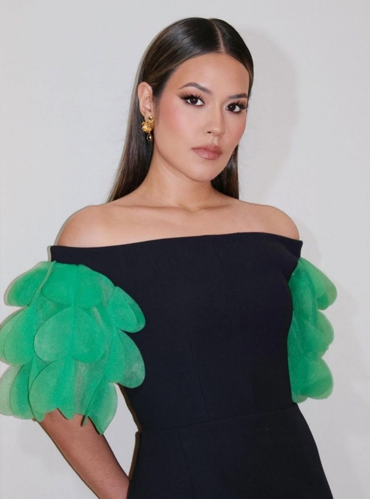 Raisa memilih off-shoulder dress dari Peggy Hartanto, label lokal yang dikenal dengan desainnya yang modern. Gaun hitam tersebut diberi aksen kelopak hijau di bagian lengan sebagai detail kontras, sementara slit di bagian depan membuat siluetnya terlihat lebih ringan. Dipadukan dengan aksesori dari Tulo La Design membuat tampilannya terlihat effortless.