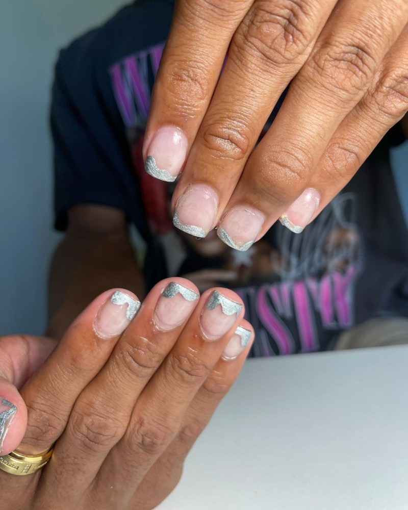 Mungkin kalian sering melihat nail art ini di Instagram. Desain chrome ini menggunakan cat kuku perak untuk aksen French tip yang bergelombang di atas cat kuku merah muda yang membaluri seluruh dasar kuku.