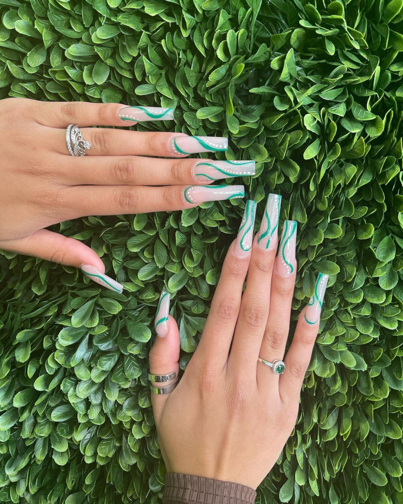 Kuku bergambar garis abstrak memang jadi andalan jika bingung ingin menggunakan desain apa. Garis hijau seperti ini menjadikan statement point agar kuku tetap terlihat on point meski dengan desain minimalis.