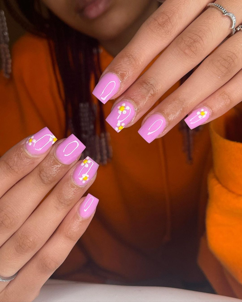 Desain yang satu ini memang simple dan mudah untuk ditiru. Aplikasikan base pink dan tunggu hingga kering. Jika sudah, mulai gambar bunga daisy dengan cat warna putih. Kalian perlu berhati-hati agar hasilnya rapi.
