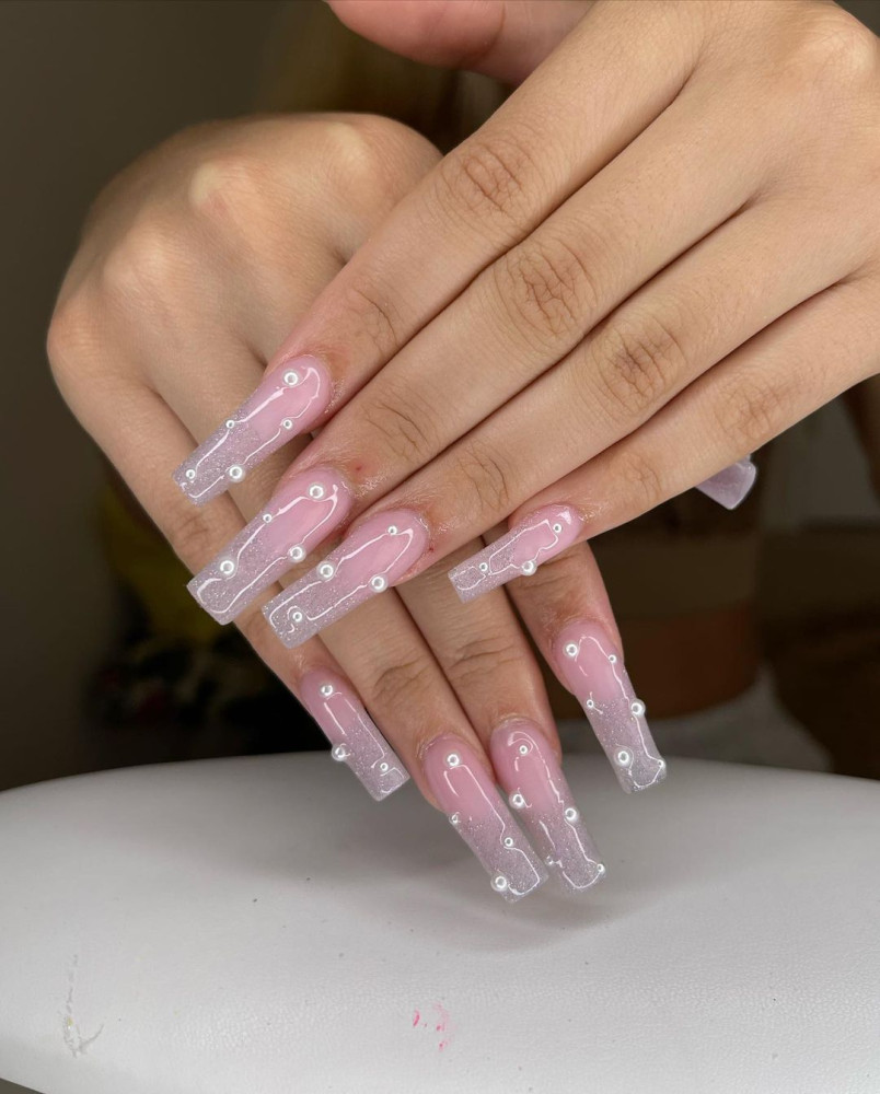 Tren kecantikan yang terinspirasi dari serial Euphoria tengah viral dan banyak digandrungi Gen Z. sama seperti nail art ini, kalian hanya perlu base berwarna soft pink dan diberi bubuk chromatic untuk menambah kialuan. Jika sudah, hias dengan manik-manik mutiara di beberapa area untuk mempermanis penampilan.